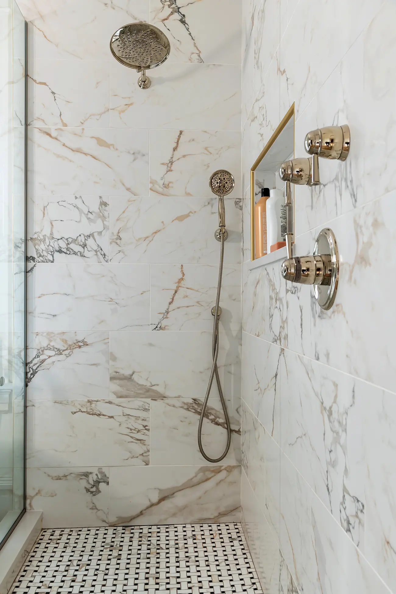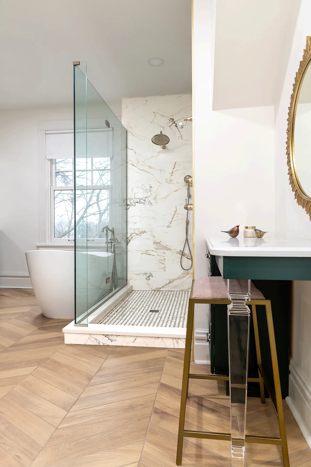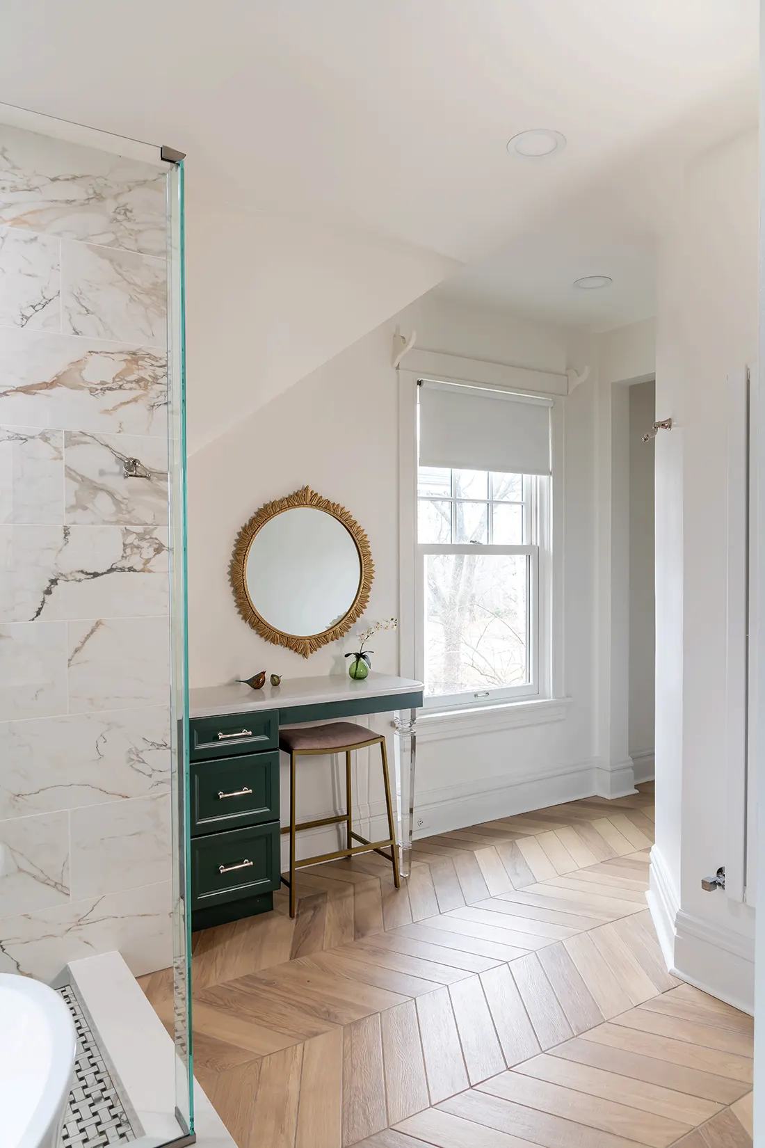 Polished nickel plumbing fixtures from Moen are paired with gold lighting and accent pieces, creating a sophisticated blend of metals that feels intentional and inviting rather than overly formal. Black-trimmed mirrors above the vanities provide contrast, while a decorative gold mirror at the makeup area adds a touch of personality. Tile selections further enhance the design, with 12×24 porcelain from Anatolia featured in the shower, accented by a basketweave pattern on the shower floor and vanity backsplash. Underfoot, a porcelain wood floor laid in a chevron pattern adds movement and warmth, tying together traditional craftsmanship with modern luxury for a space that feels both elevated and enduring.