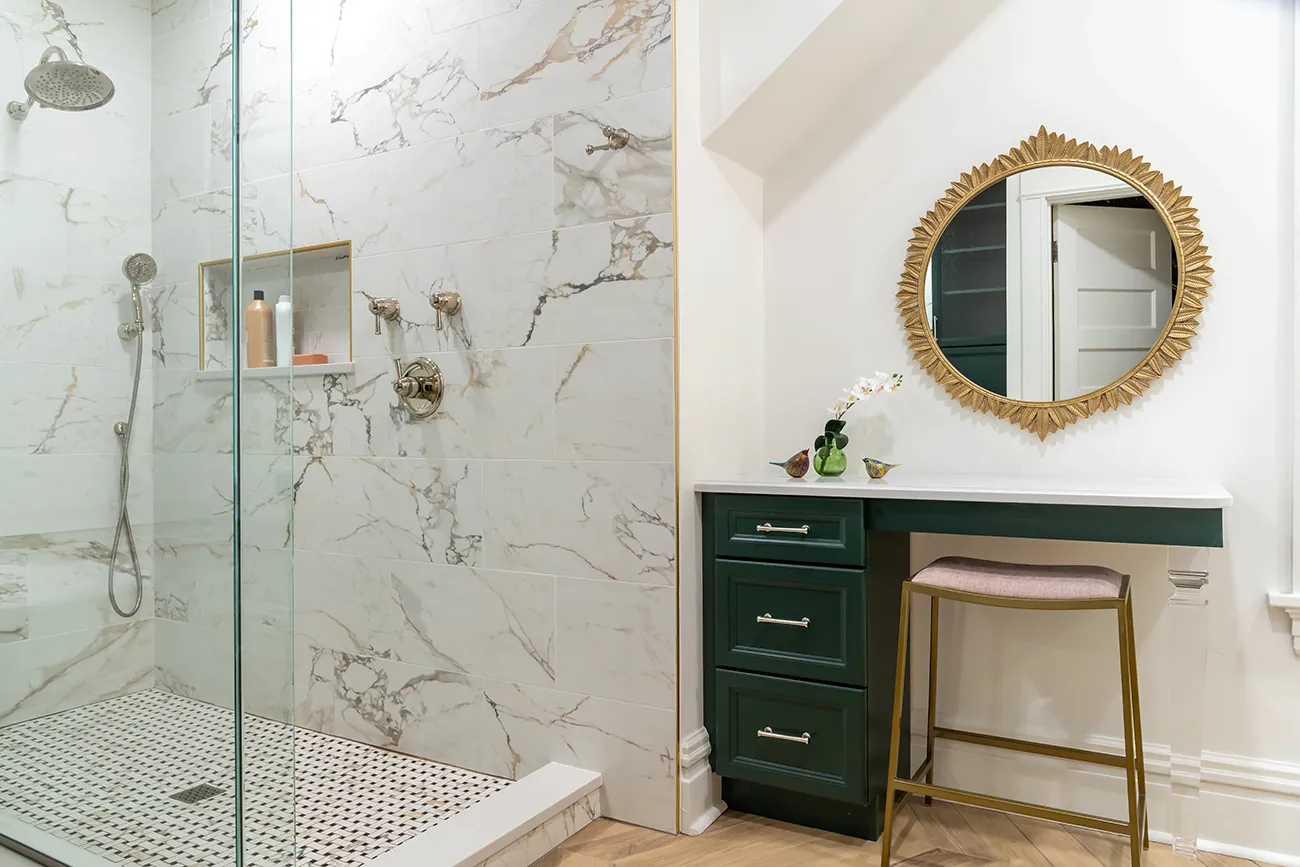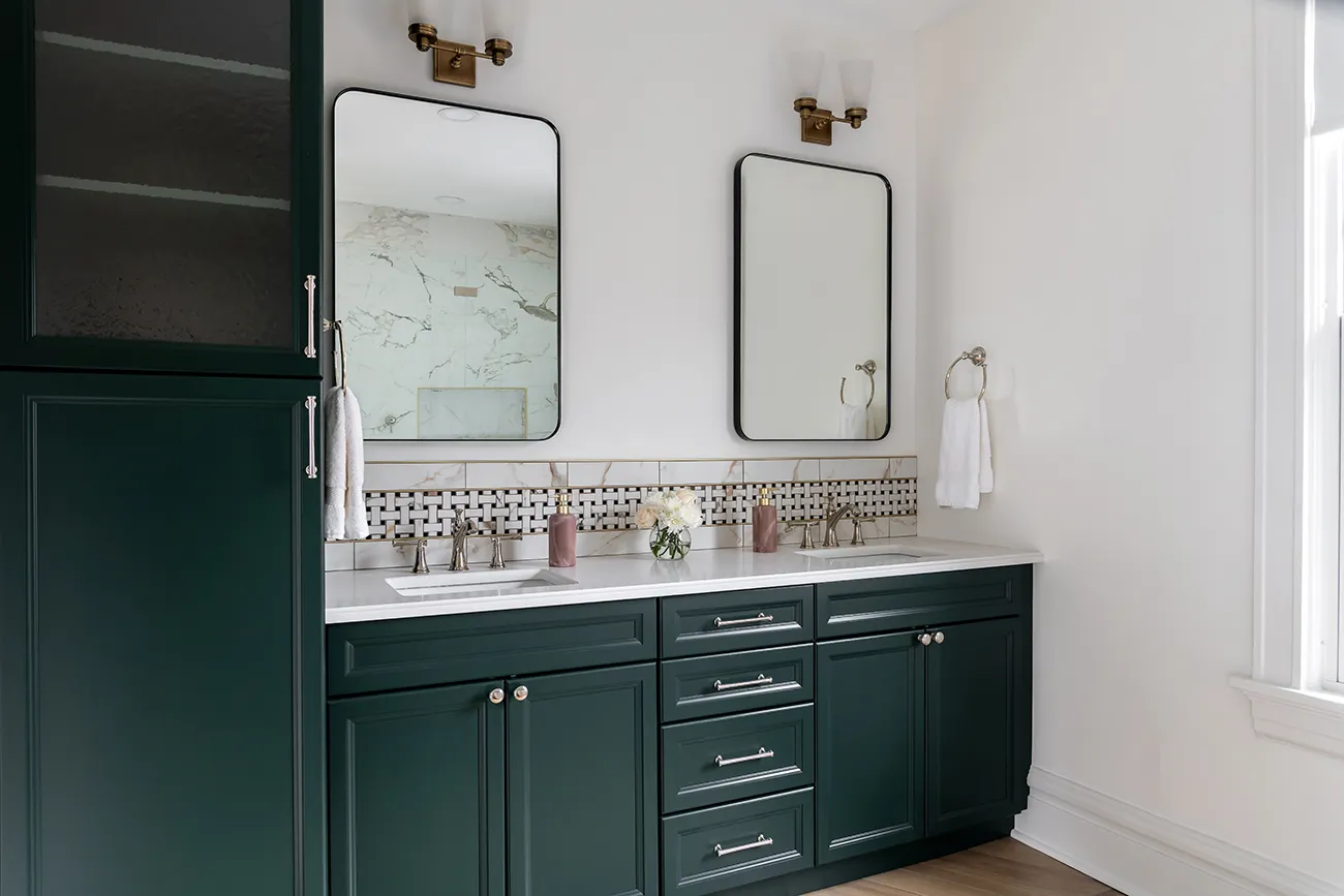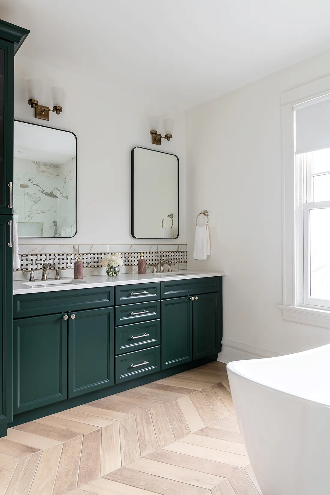 The design centers around a large walk-in shower paired with a separate freestanding tub, creating a spa-like atmosphere while maintaining a timeless aesthetic. Double-bowl vanities provide ample space for daily routines, complemented by a dedicated seated makeup vanity that adds both convenience and elegance. The cabinetry, finished in Bottle Brush Green by UltraCraft, introduces depth and warmth to the space, balancing beautifully with the layered mix of finishes throughout the room.