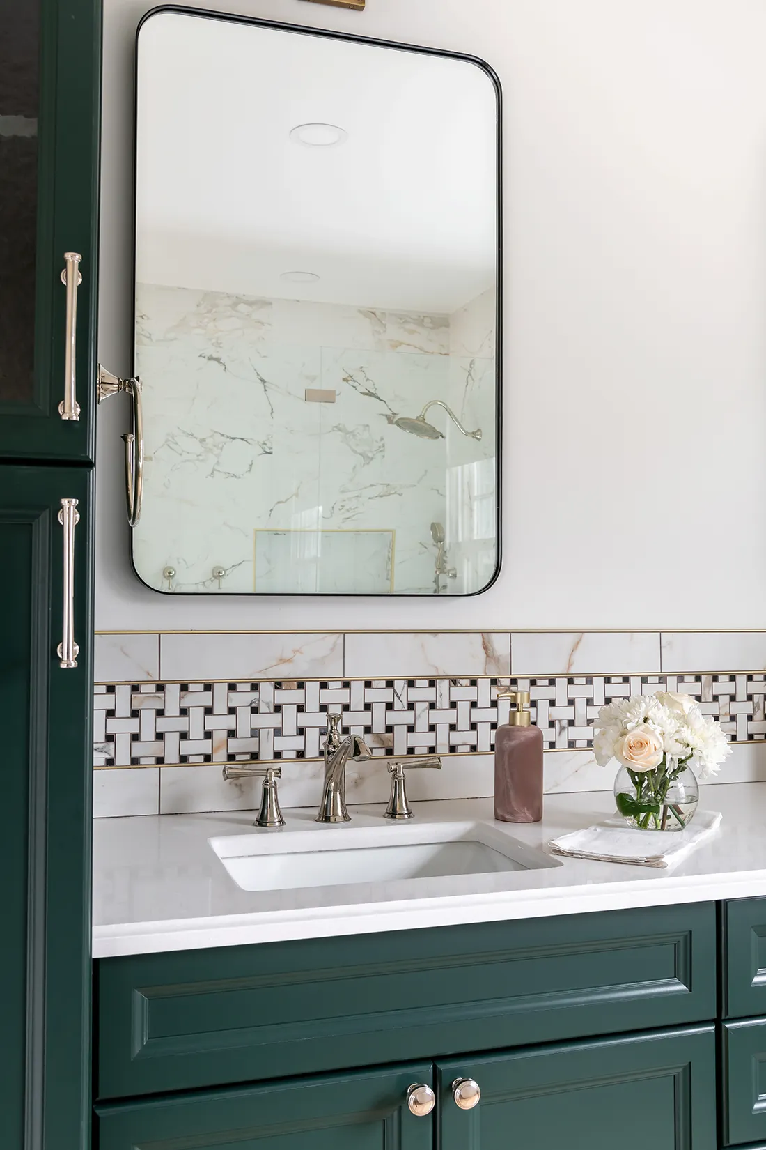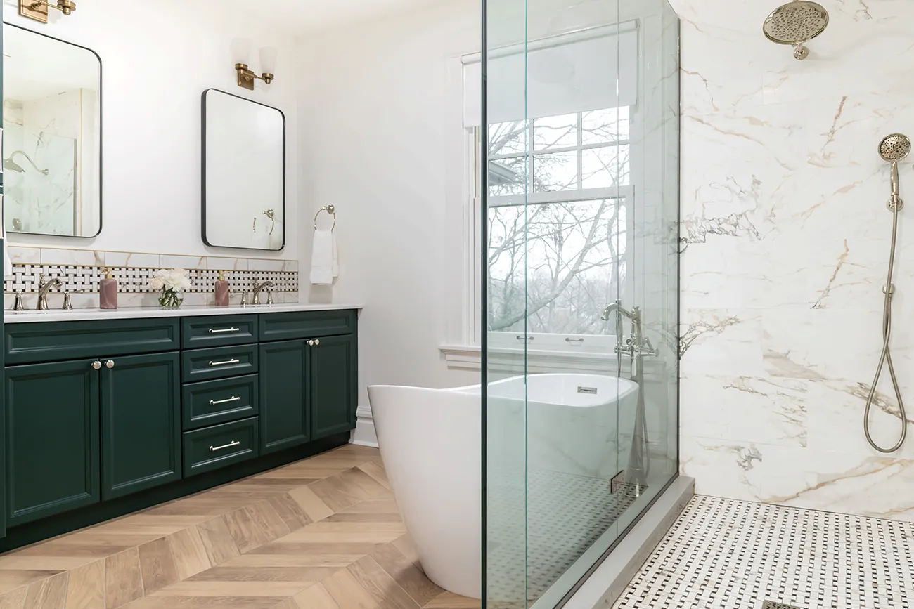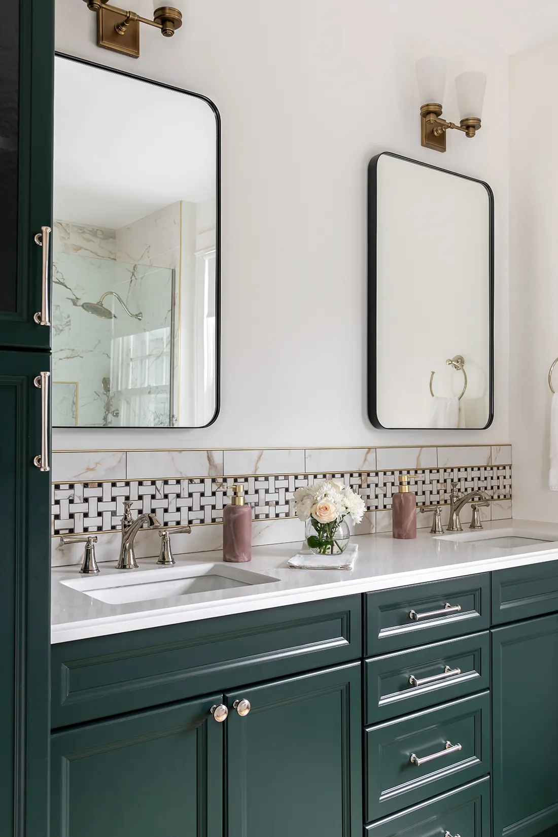 The design centers around a large walk-in shower paired with a separate freestanding tub, creating a spa-like atmosphere while maintaining a timeless aesthetic. Double-bowl vanities provide ample space for daily routines, complemented by a dedicated seated makeup vanity that adds both convenience and elegance. The cabinetry, finished in Bottle Brush Green by UltraCraft, introduces depth and warmth to the space, balancing beautifully with the layered mix of finishes throughout the room.